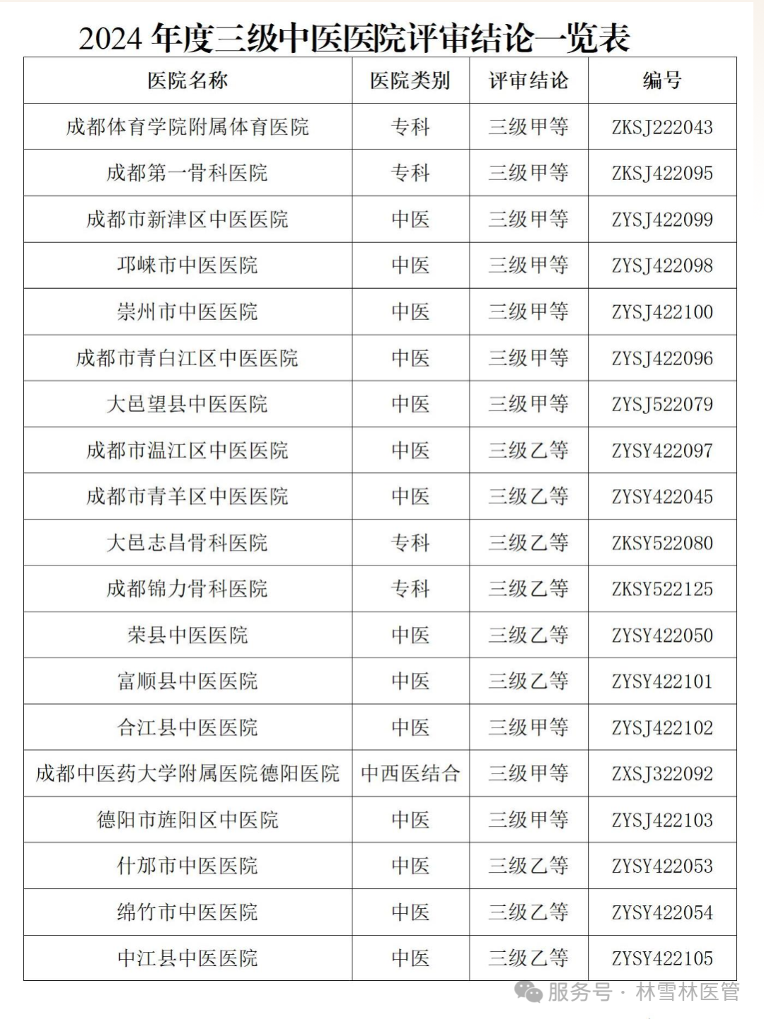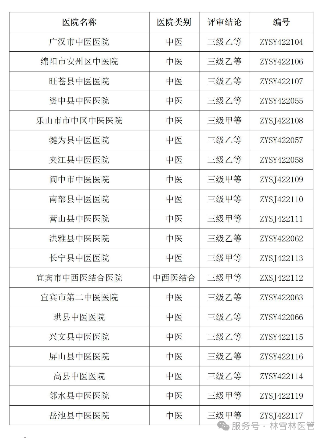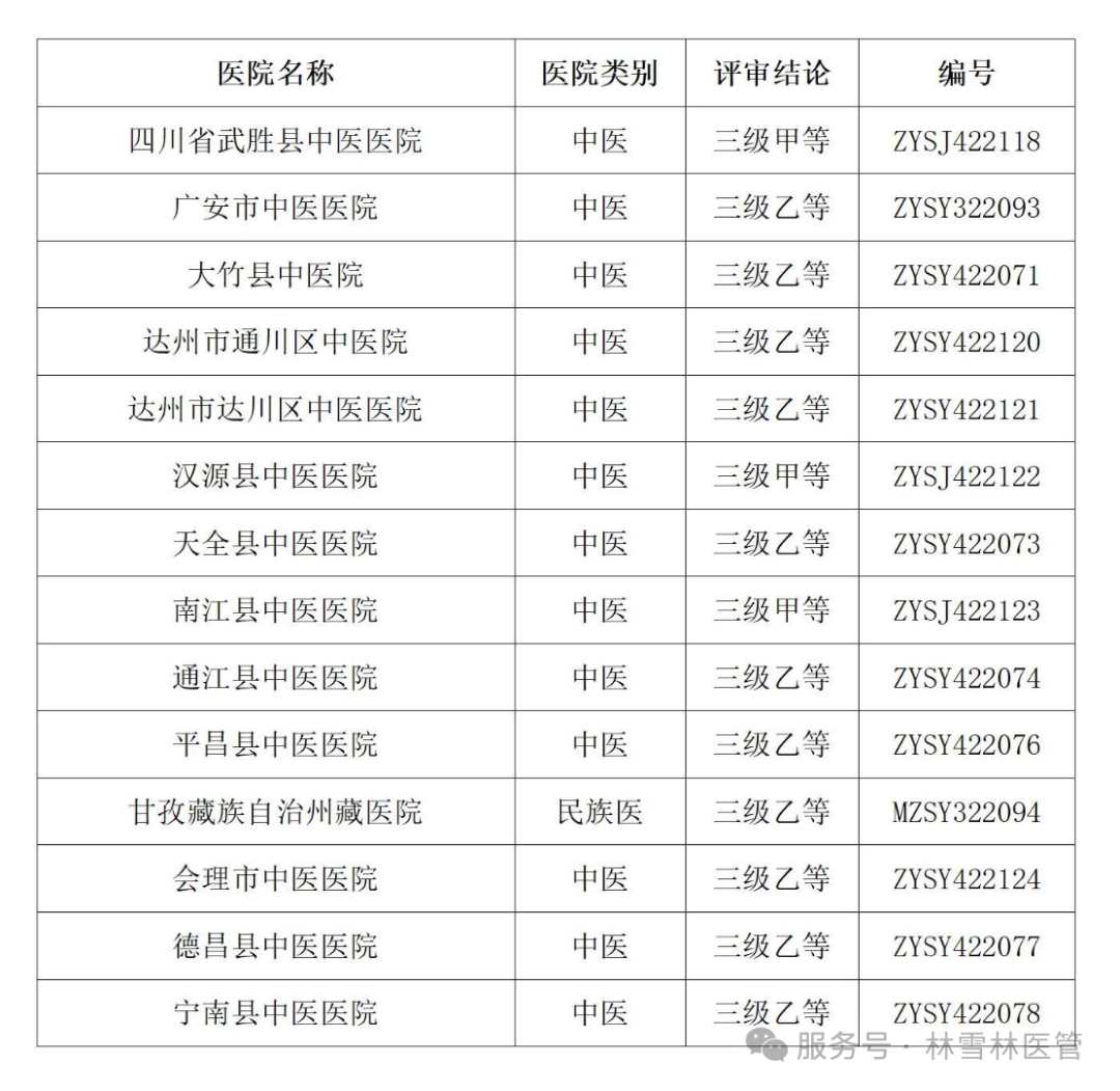 按照《中医医院评审暂行办法》等文件精神,省中医药局于2024年度组织开展三级中医医院评审,并将四川省中医医院评审委员会审议合格的三级中医医院评审结论报请国家中医药管理局备案。现将国家中医药管理局统一编号备案的三级中医医院评审结论及其编号予以公布(名单附后)。
