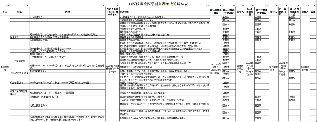 附件1:XX医院重症医学科问题整改追踪总表