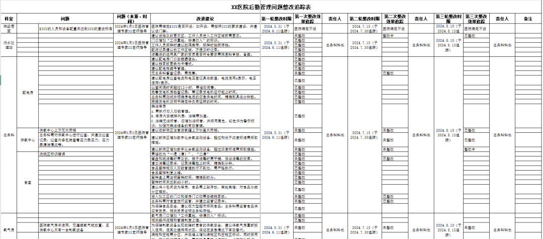 本次后勤管理专家通过资料查看、实地指导等方式,对目前医院等级评审工作提出了84条问题及不足,要求医院对上述问题于2024年5月31日前完成整改,后续公司内审员将对整改成效进行动态追踪,见附件1(XX医院后勤管理问题整改追踪表)。